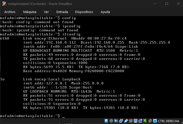Paso 3: Verificamos la dirección ip asignada por metasploitable2